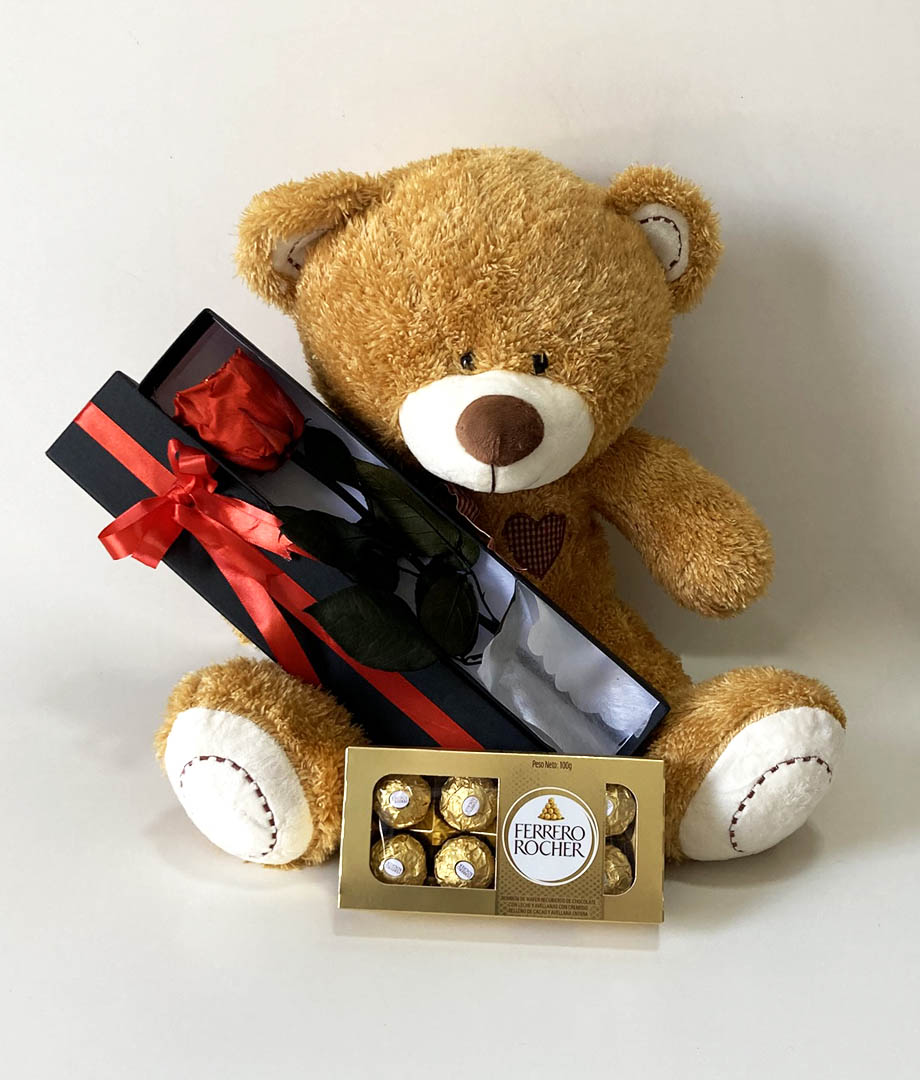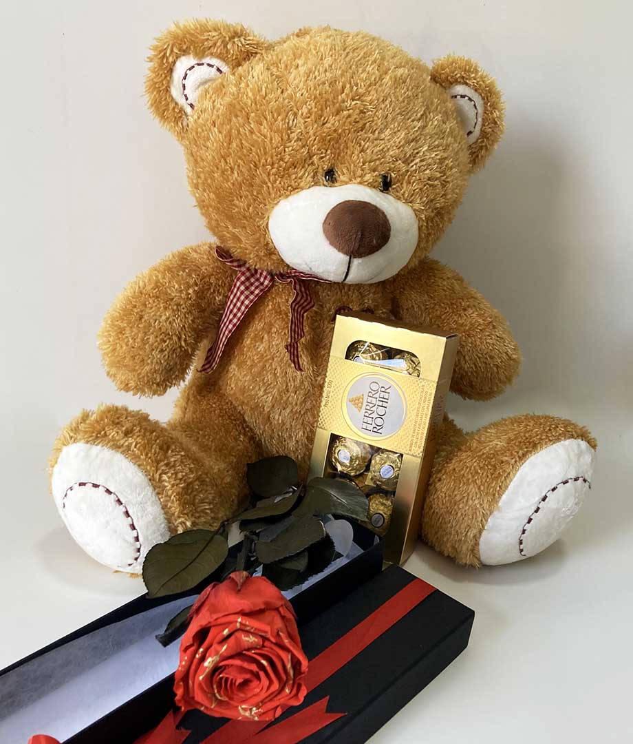 Un regalo que perdura en el tiempo y transmite ternura desde el primer momento. Esta delicada rosa preservada se presenta en una elegante cajita, acompañada de un tierno oso de peluche de 40 cm y un exquisito chocolate Ferrero Rocher de 100 g, creando una combinación perfecta para sorprender