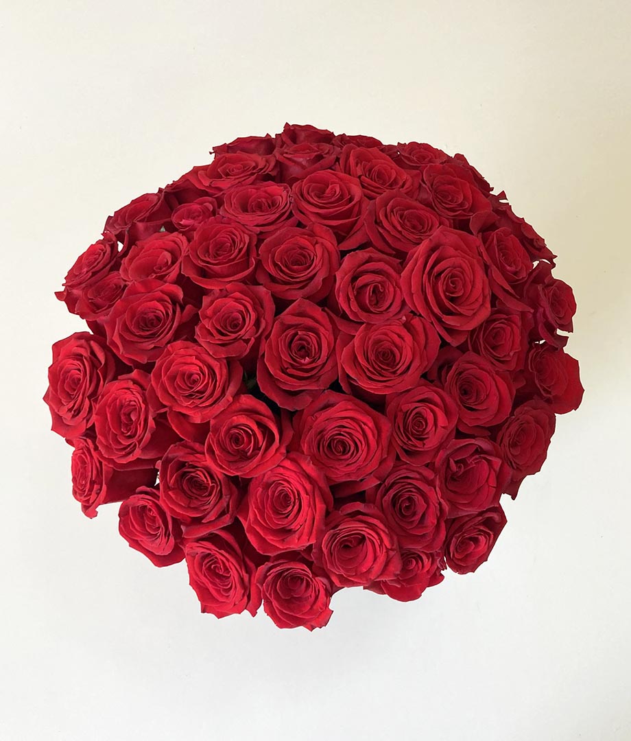 Imponente arreglo floral presentado en un florero de vidrio, compuesto por 50 rosas rojas ecuatorianas, símbolo eterno de amor, pasión y romanticismo.
