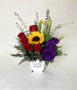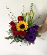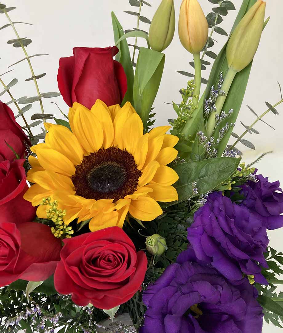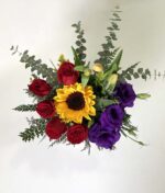 - Lindo arreglo en balde con rosas ecuatorianas, lisianthus, tulipanes y girasol, con eucalipto y follaje