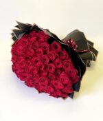 - Gran y hermoso ramo buchón con 100 Rosas ecuatorianas, envueltas en papel decorativo y roseton de cinta