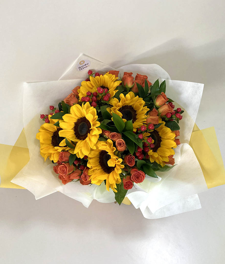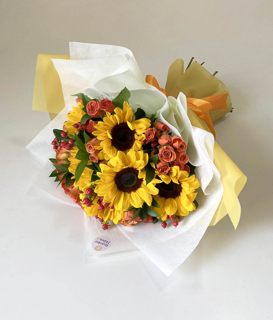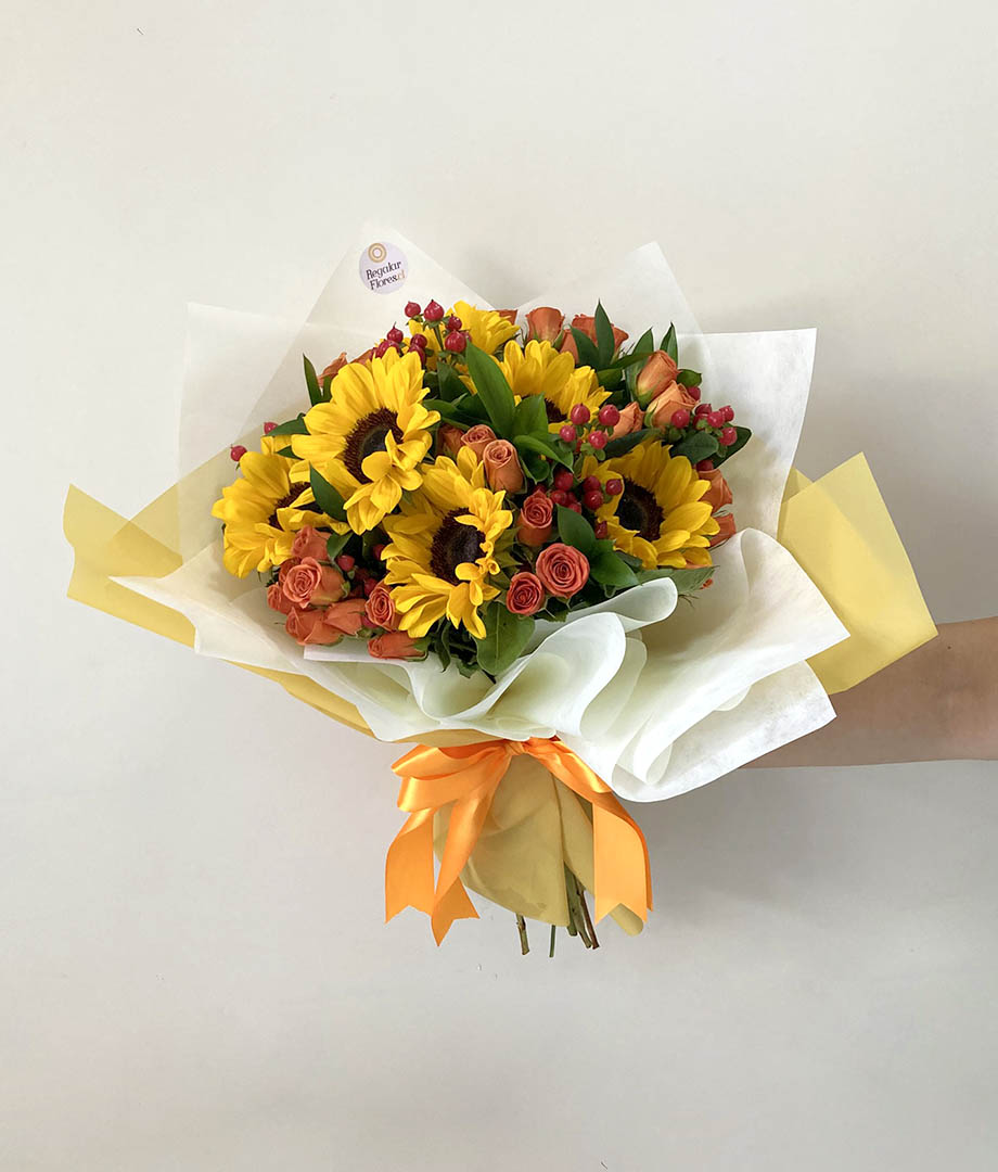 • Ramo floral vibrante y lleno de vida. Está compuesto por 6 girasoles, 10 minirosas naranjas y 6 hypericum rojo, acompañados de ruscus para complementar. Está envuelto en papel decorativo, con cinta de raso anaranjada, que realza su estilo alegre y moderno.