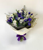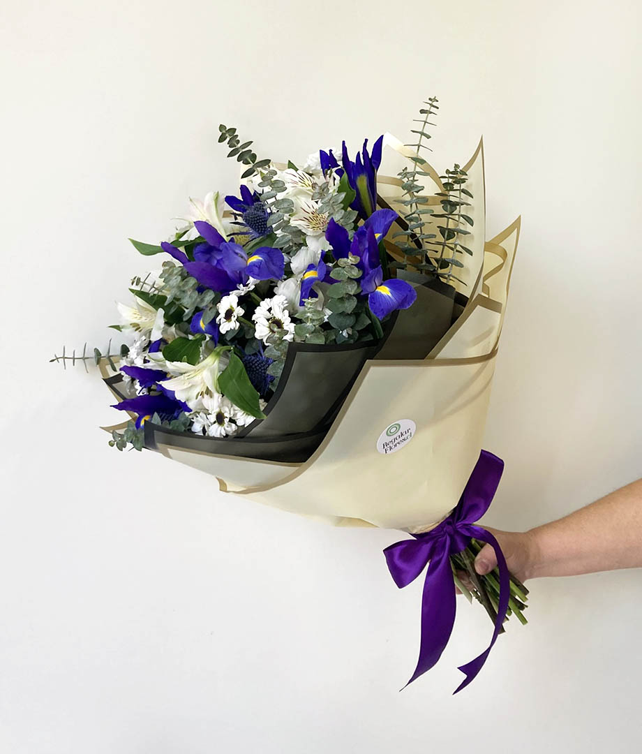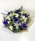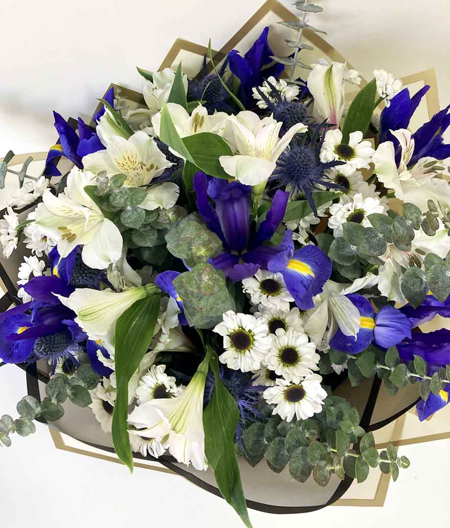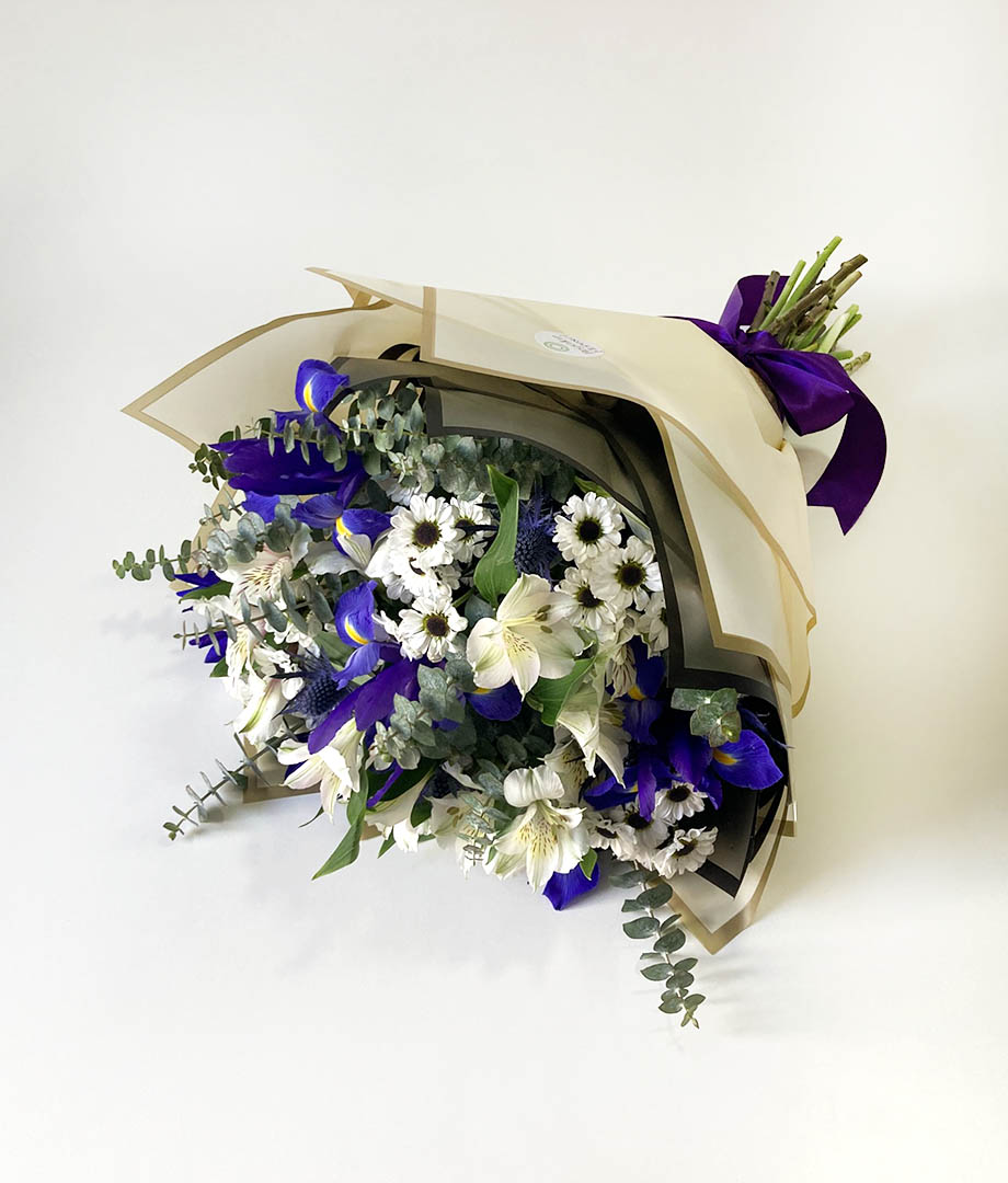 - Hermoso ramo de Iris, Crisantemos, alstroemerias y eucalipto, envuelto en papel decorativo y cinta de raso.