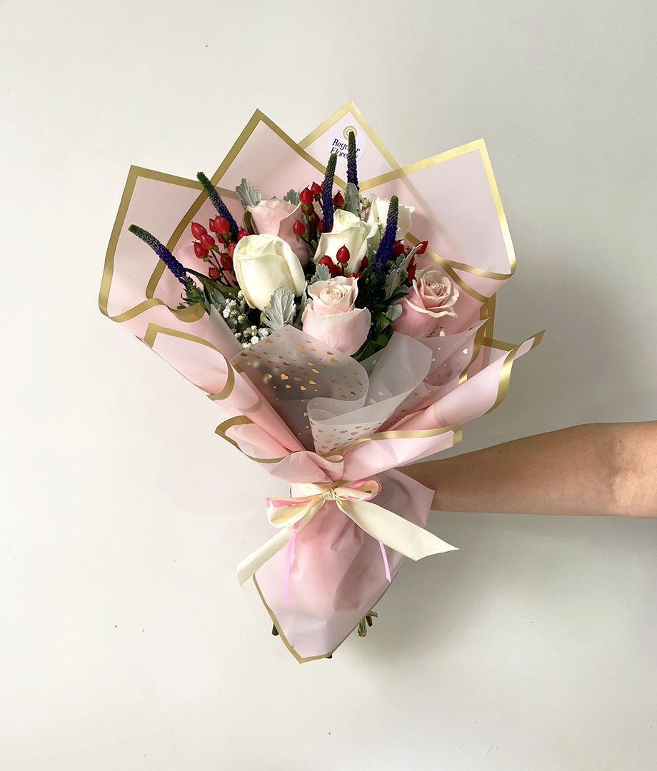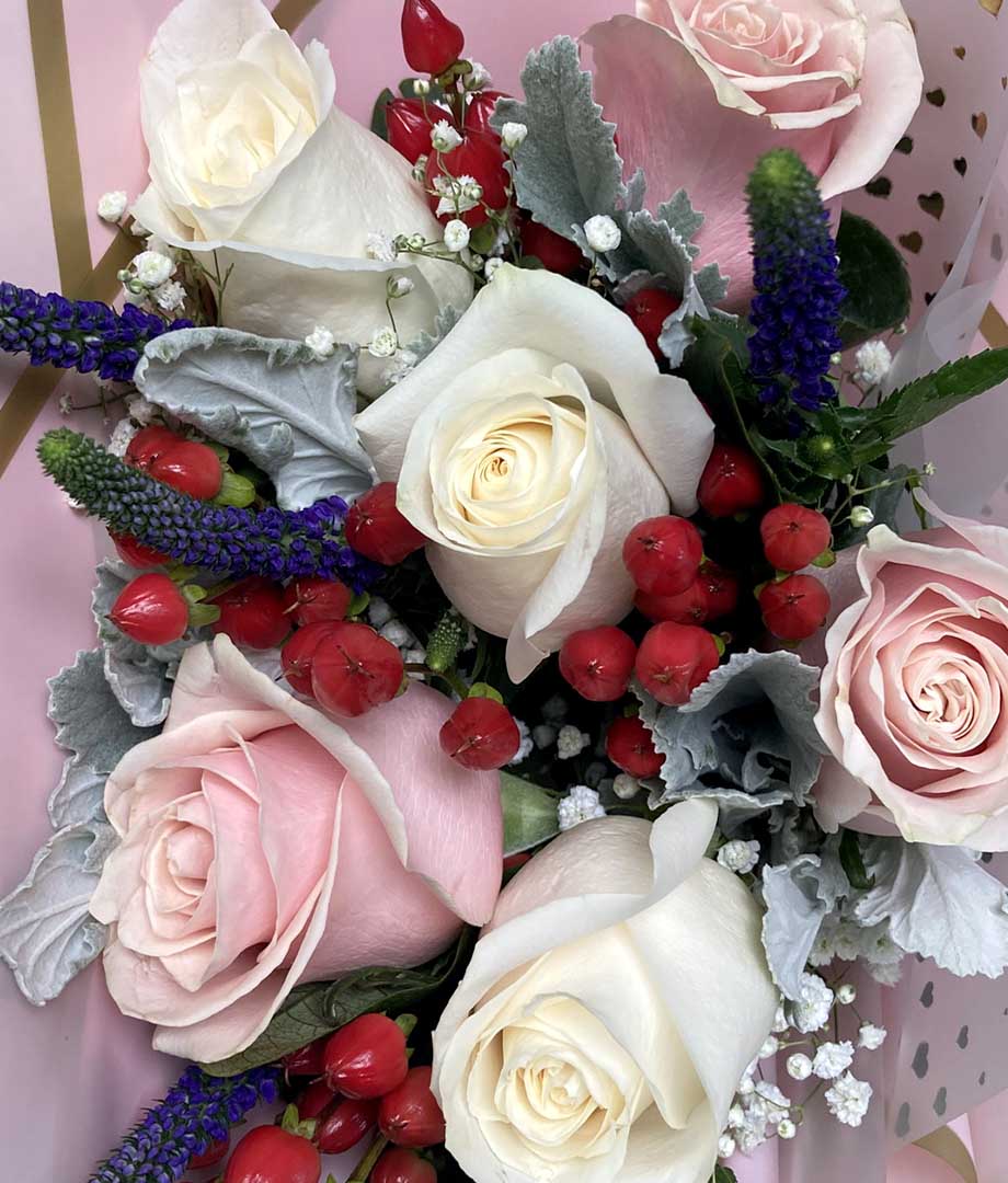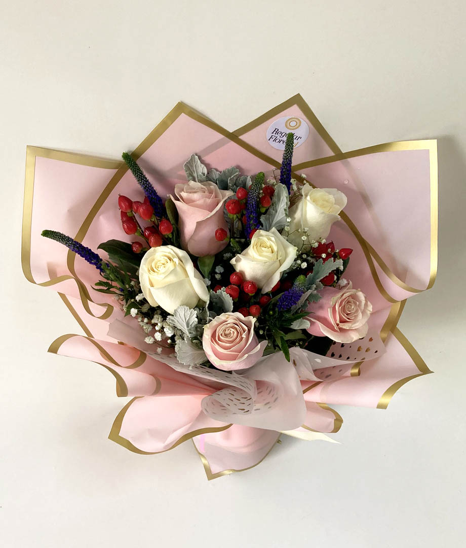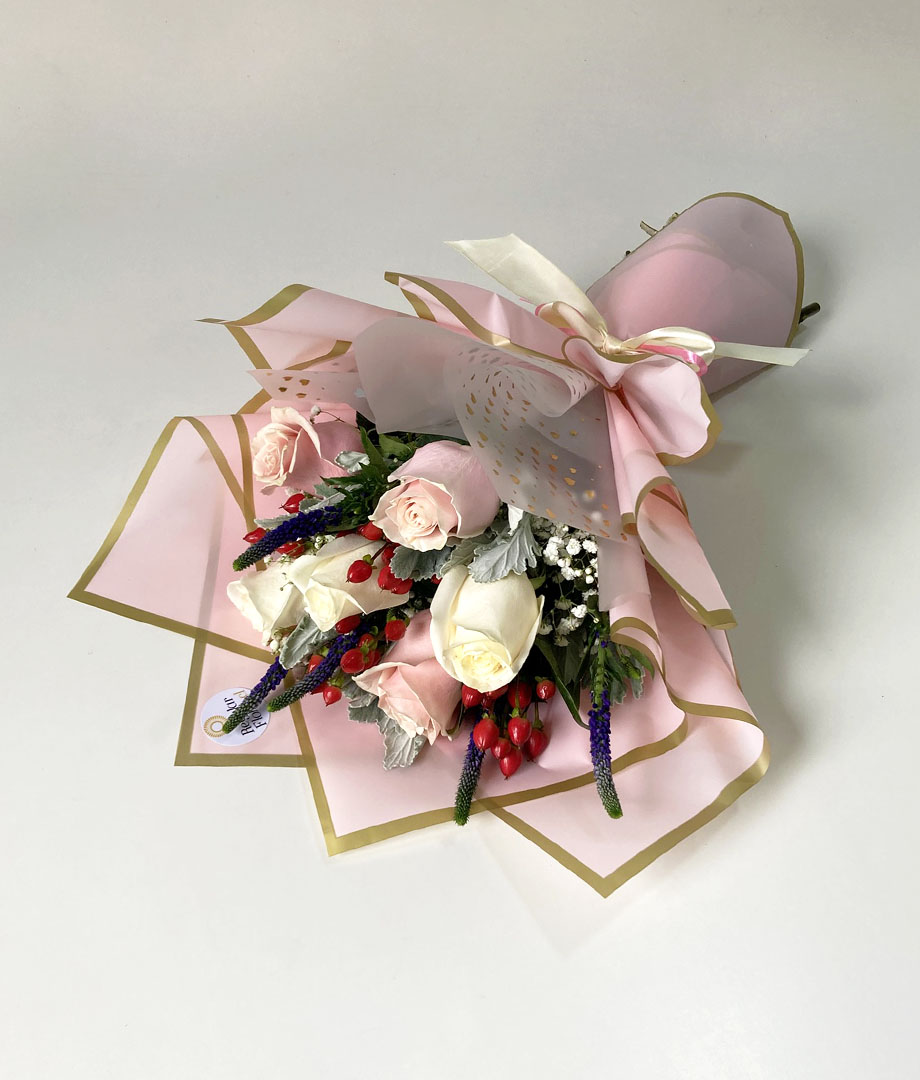 • Ramo floral elegante y armonioso. Está compuesto por 6 rosas ecuatorians rosadas y blancas, acompañadas de hypericum, verónicas moradas, hojas de cineraria y delicados toques de gypsophilia. Se presenta envuelto en papel rosado y terminado con cinta de raso, logrando un acabado delicado y femenino