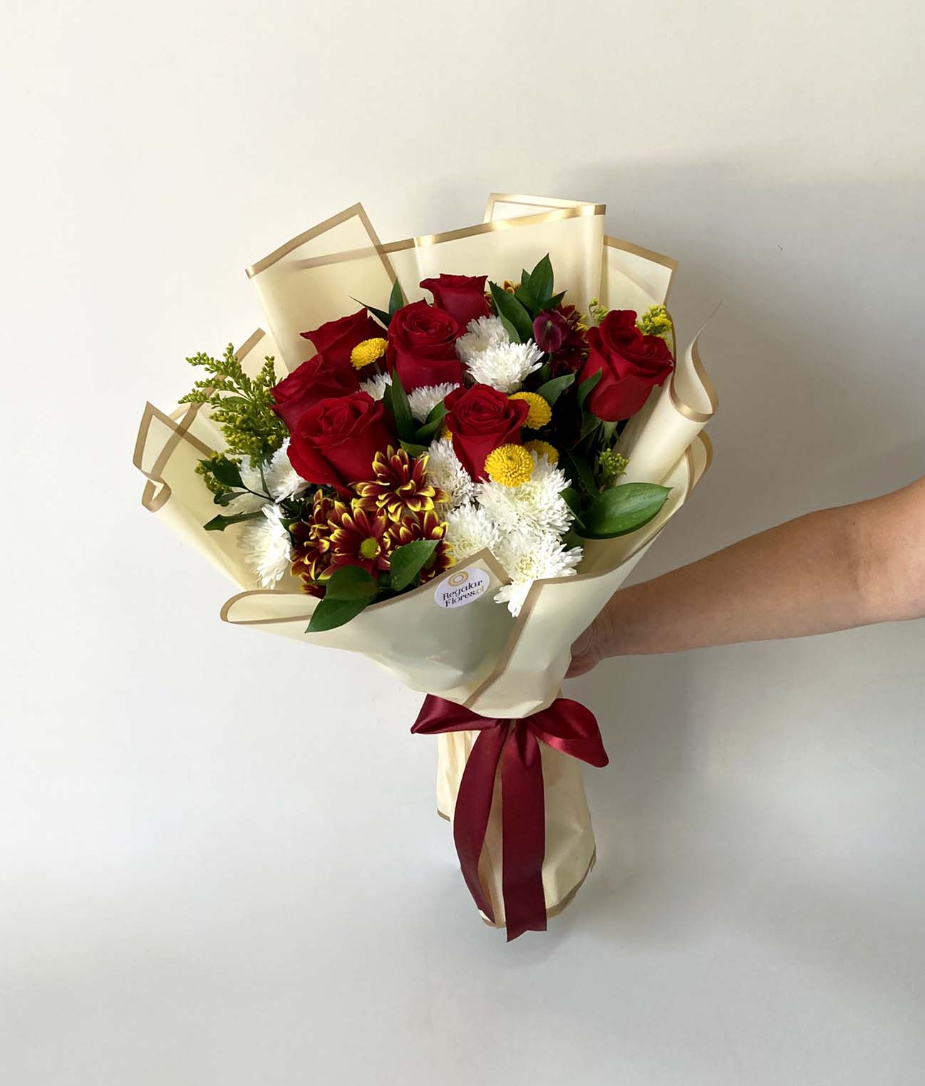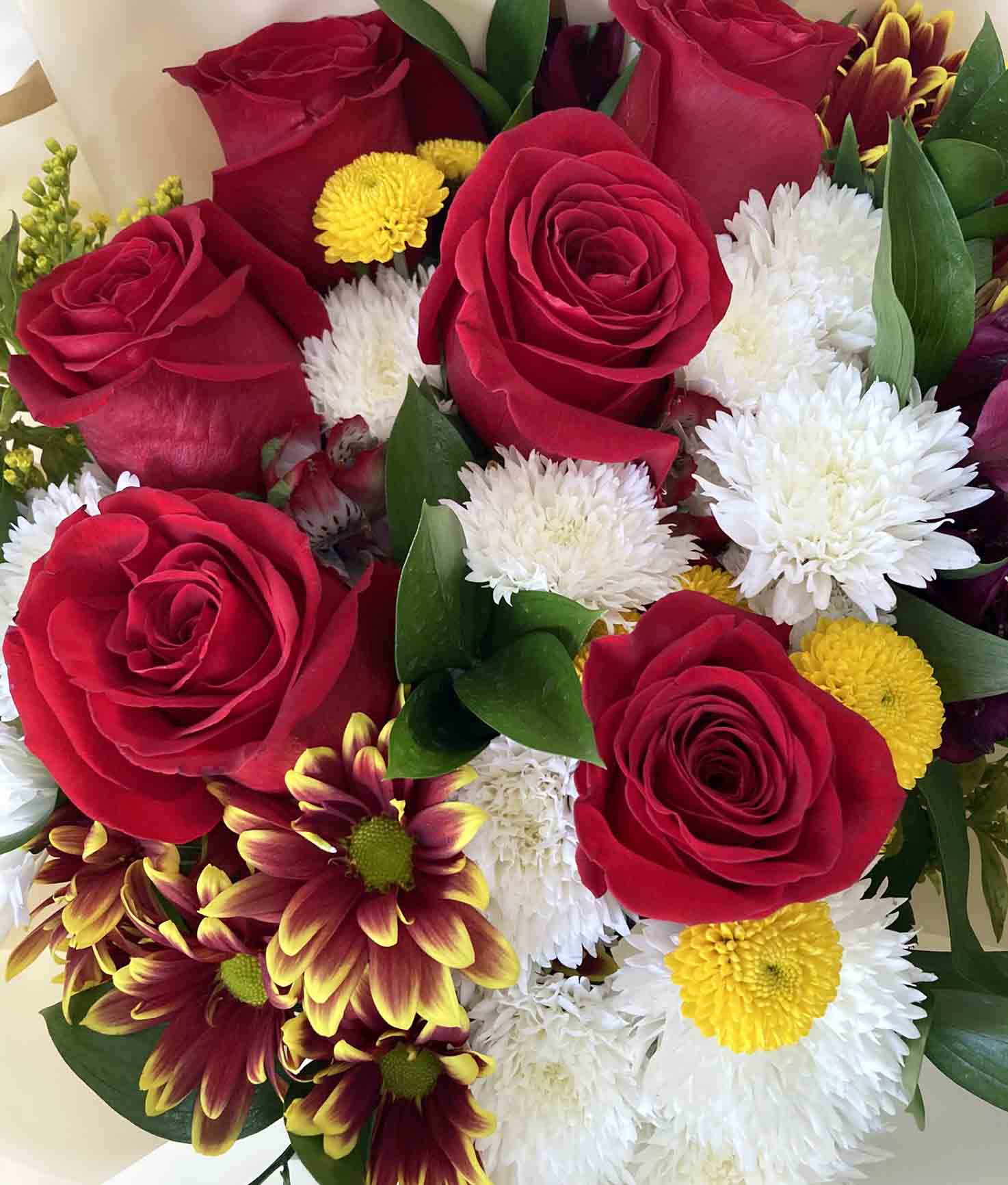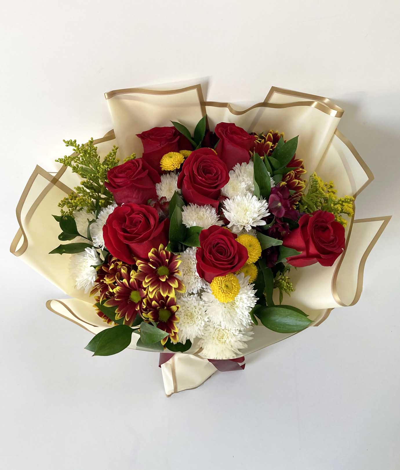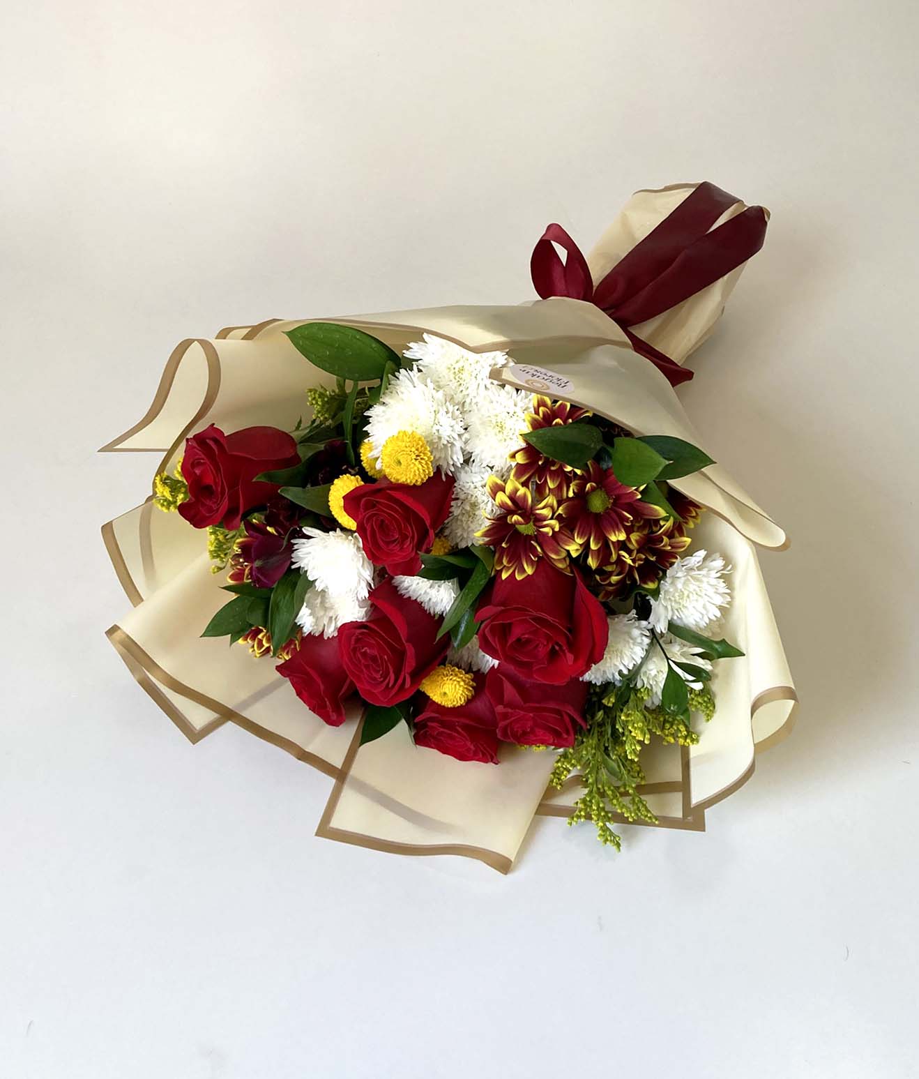 Ramo floral lleno de color, vida y elegancia, compuesto por 7 rosas rojas ecuatorianas, acompañadas de 8 crisantemos en tonos variados , se complementa con 4 alstroemerias, toques de solidago y varitas de ruscus, creando una combinación armónica de texturas y colores. Su presentación en papel color crema con cinta burdeo realza su estilo clásico y sofisticado