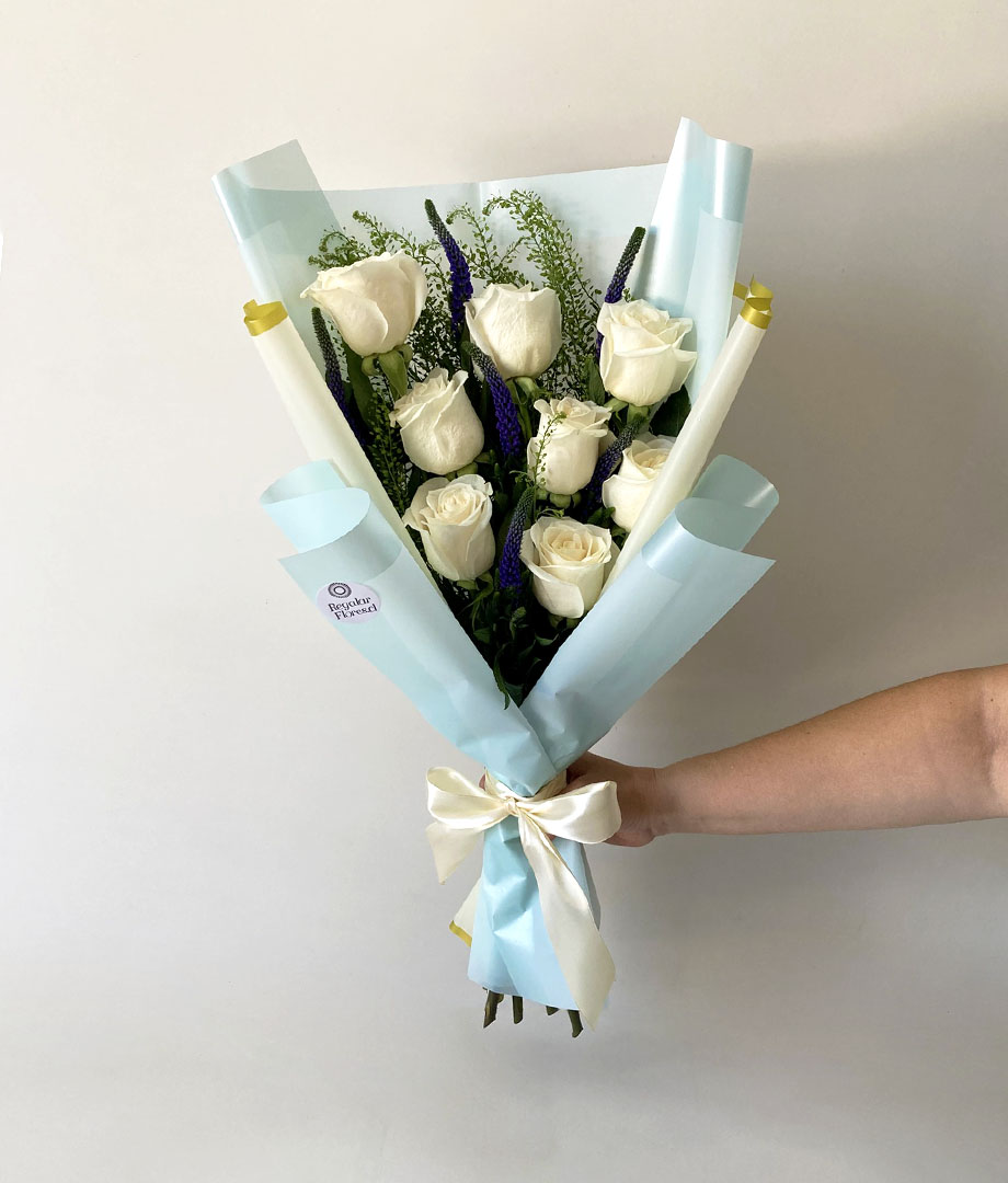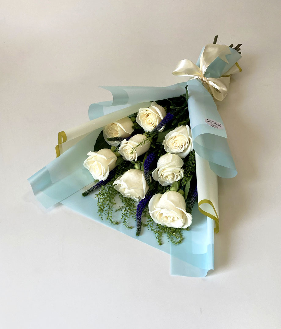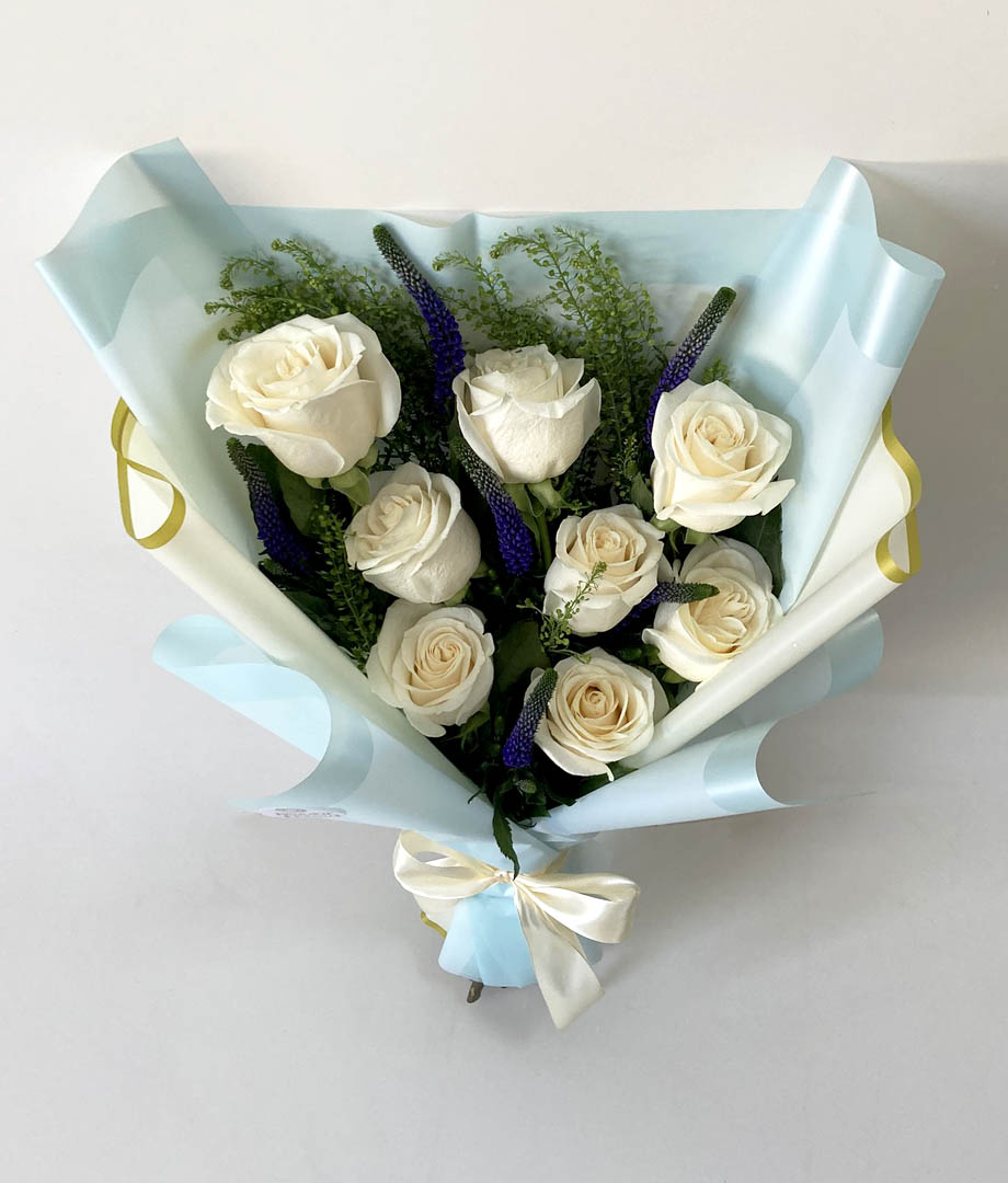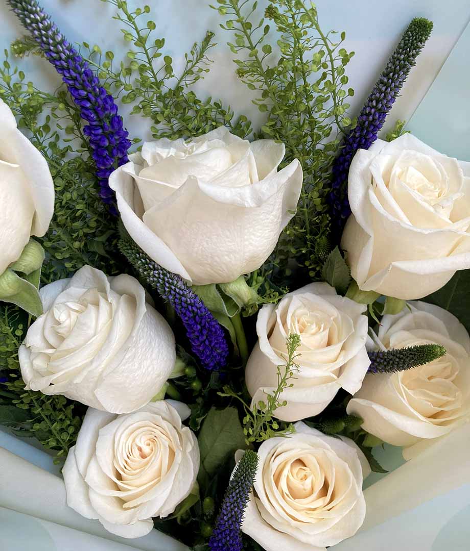 - Delicado y elegante ramo floral que combina 8 rosas blancas ecuatorianas junto a 5 verónicas moradas que aportan un contraste sutil y sofisticado, complementado con toques de follaje. Envuelto en papel decorativo celeste y terminado con cinta de raso blanca, este ramo destaca por su estilo suave y refinado, ideal para transmitir calma, cariño y admiración